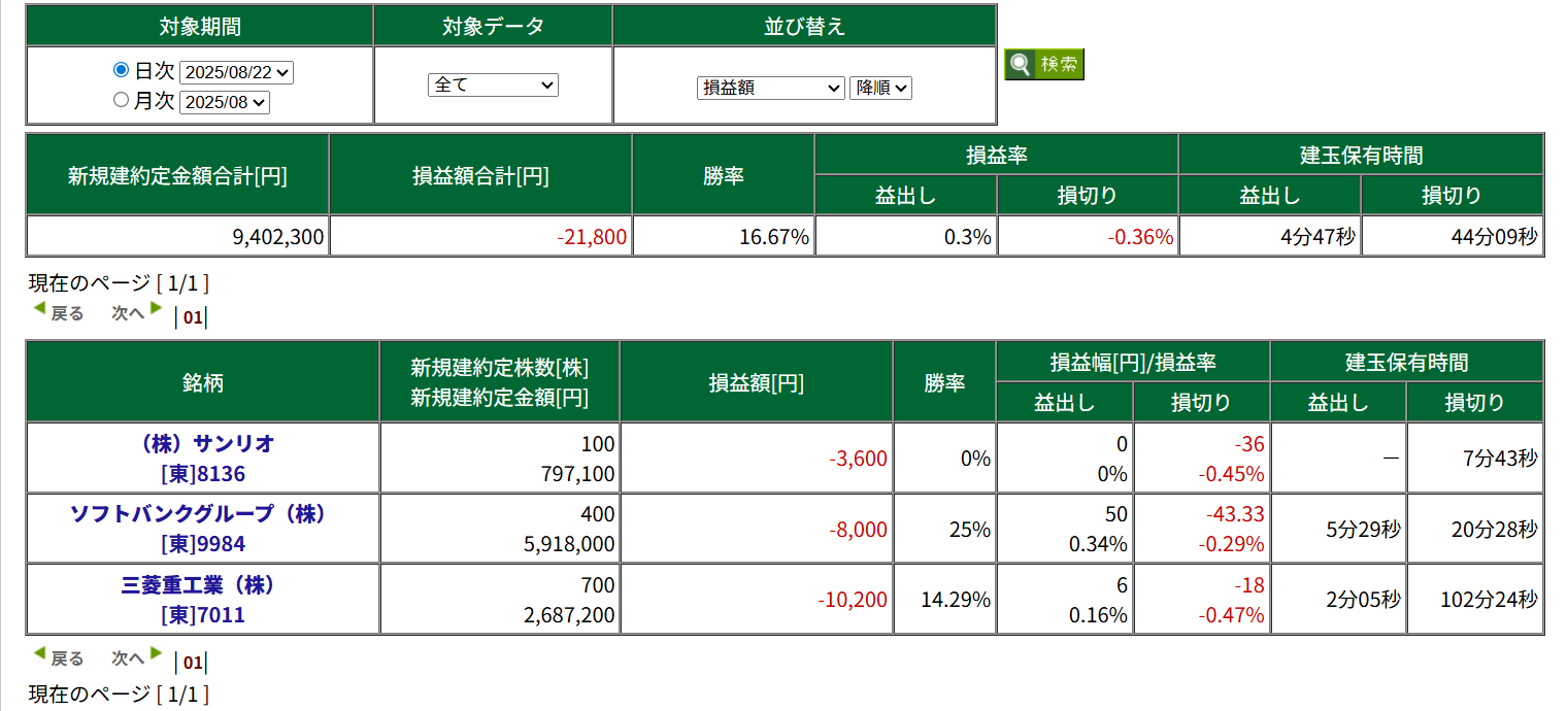 2025/08/22 デイトレード収支 デイトレ Twitter Facebook はてブ Pocket LINE コピー 2025.08.22 今日も三菱重工(7011)ソフトバンクグループ(9984)サンリオ(8136)とはいりましたが、どれもダメでした。 今日の収支はマイナス¥21,800でした。 ちょっと負けが続いてきたので、ロットをまた少し下げて来週からがんばります。