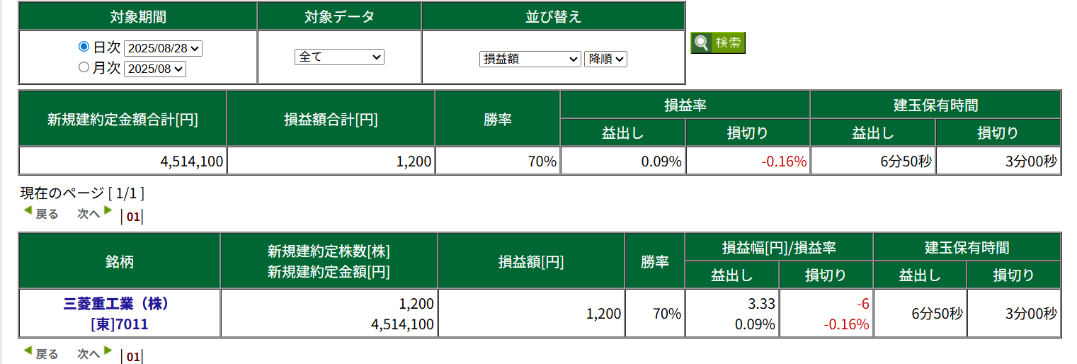2025/08/28 デイトレード収支 デイトレ Twitter Facebook はてブ Pocket LINE コピー 2025.08.28 今日も三菱重工を少しだけはいりました。 もう大負けしたくないので、ロット小さいトレードをしていこうと思います。 今日の収支はプラス¥1,200でした。 ランチ代を稼ぐデイトレ投資法で行こうと思います。