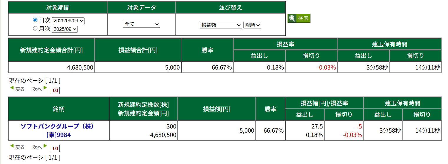 今日もソフトバンクグループ(9984)をちょっとだけはいりました。上値が重そうだったので空売りをちょこっとだけトレード。