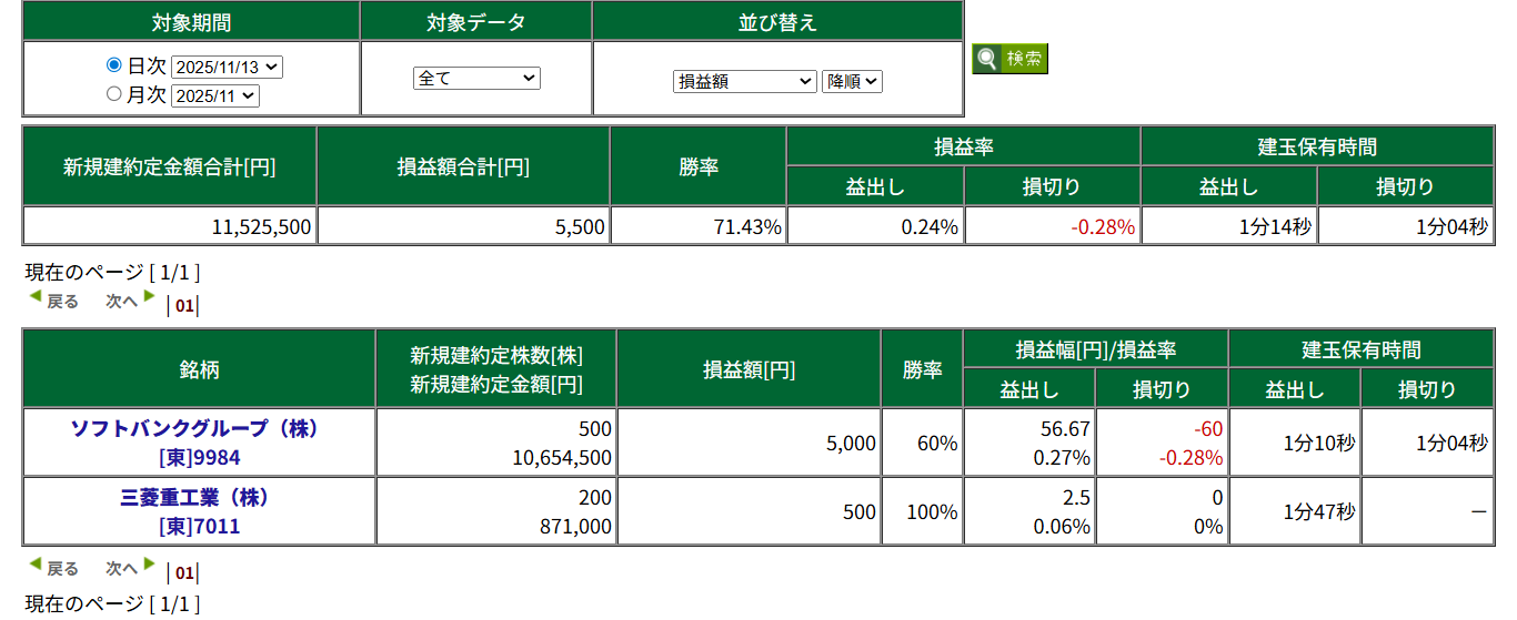 2025/11/13 デイトレード収支 デイトレ Twitter Facebook はてブ Pocket LINE コピー 2025.11.13 今日もソフトバンクグループにはいりました。 今日も冴えないトレードでしたが、自分の実力では負けなければよしです。 今日の収支はプラス¥5,500でした。 明日は金曜日なので毎度のことですが1円でもいいので勝って週末を迎えたいな。
