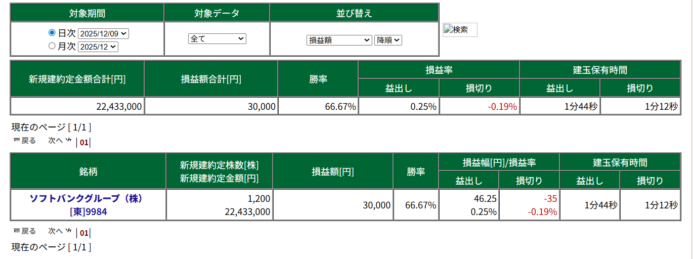 2025/12/09 デイトレード収支 デイトレ Twitter Facebook はてブ Pocket LINE コピー 2025.12.09 今日もソフトバンクグループにはいりました。 今日は勝率60%こえましたが、色々反省することがありました。 今日の収支は+¥30,000でした。 そろそろドカン負けきそうなので気をつけてがんばります。