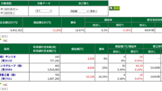 デイトレ 2025/08/22 デイトレード収支 今日も三菱重工(7011)ソフトバンクグループ(9984)サンリオ(8136)とはいりましたが、どれもダメでした。 今日の収支はマイナス¥21,800でした。 ちょっと負けが続いてきたので、ロットをまた少し下げて来週からがんばり... 2025.08.22 デイトレ
